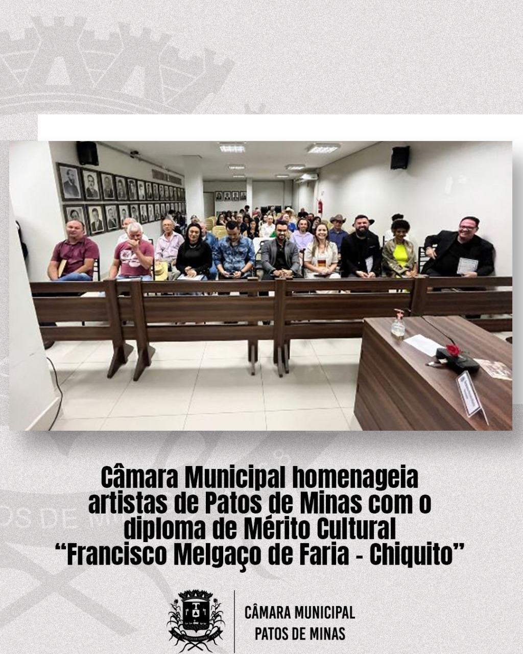 Em noite de valorização e incentivo à cultura de Patos de Minas e região, realizada nessa terça-feira (8/11), a Câmara Municipal de Patos de Minas condecorou 11 artistas com o diploma de Mérito Cultural “Francisco Melgaço de Faria – Chiquito”. Destaques em diversos estilos musicais, os homenageados foram ovacionados por familiares, amigos, vereadores e autoridades presentes no evento.