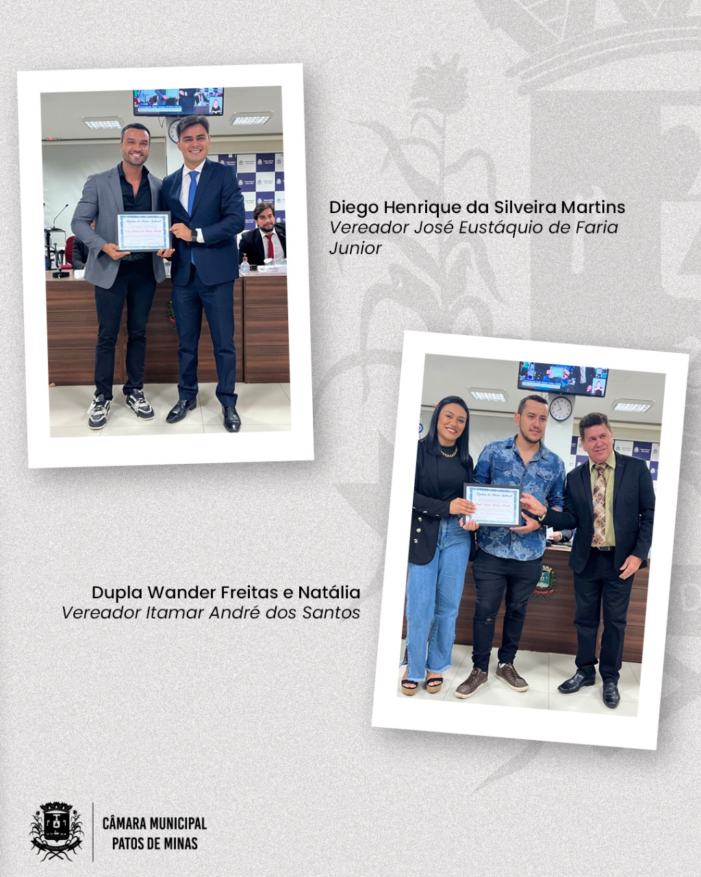 Diego Henrique da Silveira Martins - Vereador José Eustáquio de Faria Junior: Filho de Celdimar Martins da Silva e Terezinha Dias da Silveira, e irmão de Thiago, Guilherme e Gustavo, Diego Henrique da Silveira Martins já desempenhou várias funções na área musical em Patos de Minas, como primeira voz em dupla sertaneja e vocalista de banda baile.