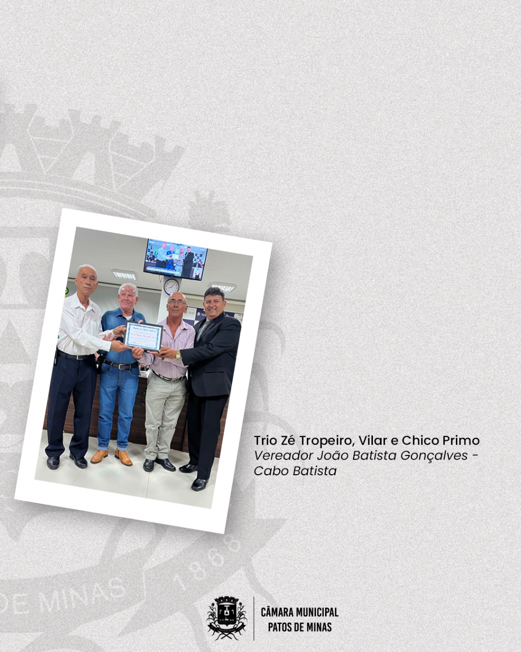 Diante da expertise dos músicos Zé Tropeiro e Vilar, o trio gravou as músicas: “Terra Molhada”, em homenagem ao homem do campo”; “Dito Cancioneiro”, em homenagem ao compositor Benedito Seviero da música Boate Azul; “Abençoado Torrão”, em homenagem à saudosa Mariazinha do Aragão, que constituiu, em sua propriedade, uma escola rural em 1955; e “Coração de Caboclo” em homenagem a Zé Marreiro, violeiro e radialista da Rádio Patos. Recentemente, o trio fez uma turnê, apresentando-se nas cidades de Felixlândia, na festa da Padroeira; de Belo Horizonte, na festa da ASPRA; e de Caeté, no encontro de Militares Veteranos da PM/MG. Por tudo isso, o trio musical “Zé Tropeiro, Vilar e Chico Primo” recebe esta merecida homenagem de Mérito Cultural da Câmara Municipal de Patos de Minas.
