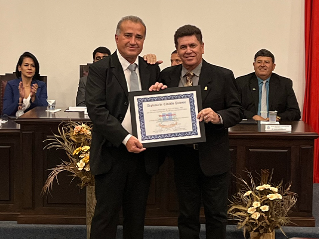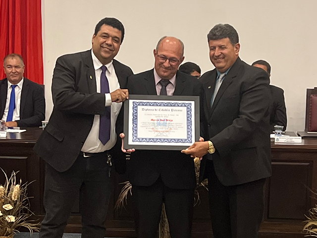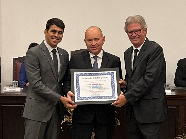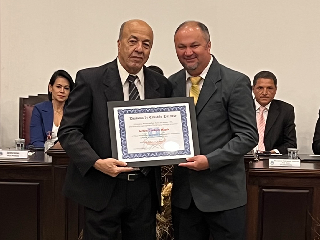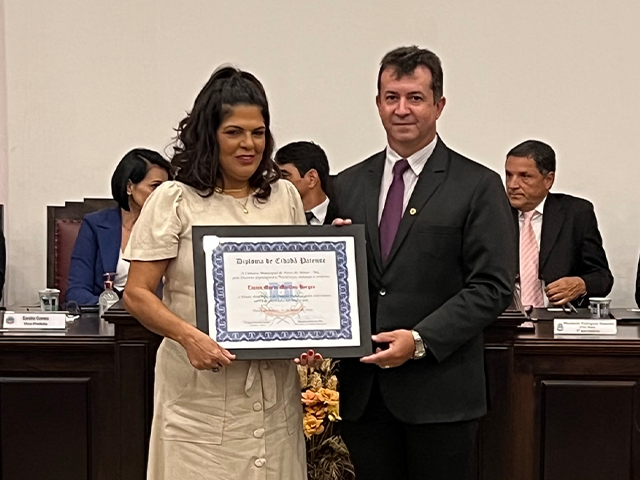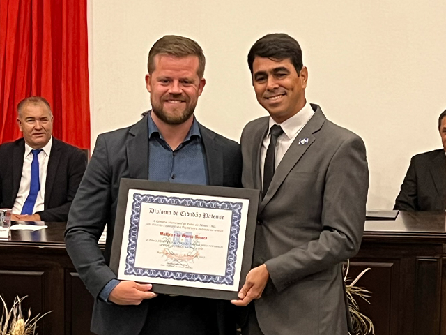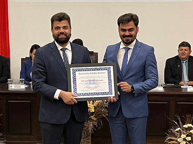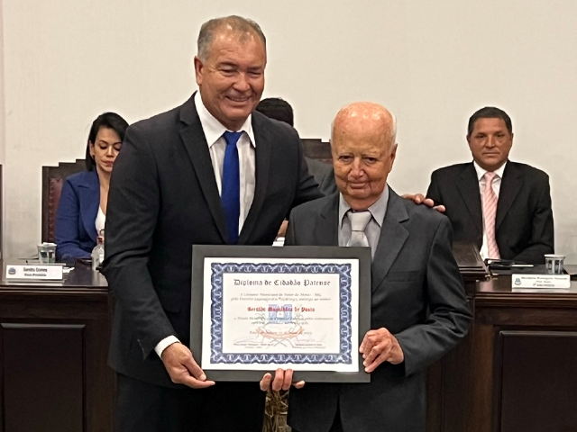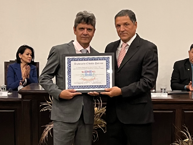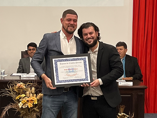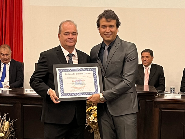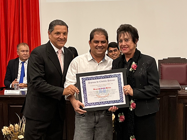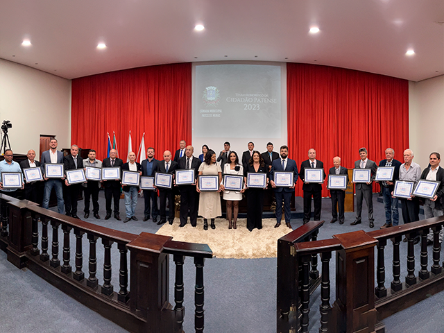 Como parte das comemorações do aniversário de 131 anos de Patos de Minas, a Câmara Municipal outorgou, durante sessão solene realizada na noite de segunda-feira (22/5), no salão do Júri do Unipam, o Título Honorífico de Cidadão Patense a 20 personalidades não nascidas em Patos de Minas, que contribuem para o desenvolvimento do Município. Além dos títulos de 2023, foram entregues os títulos de 2019 e 2020 para os cidadãos que não receberam o diploma em data oportuna. Toda a solenidade foi traduzida e interpretada na Linguagem Brasileira de Sinais - Libras.