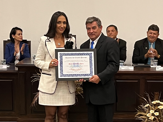 A vice-prefeita Sandra Cristina Gomes representou o Executivo Municipal durante a solenidade. Ela disse se sentir honrada em participar “desta noite tão especial”; falou das riquezas de nossa cidade, na culinária, no agronegócio, na natureza, no agro, e “especialmente as pessoas, nosso maior patrimônio”, reforçou Sandra. A vice-prefeita salientou a “seleta e assertiva” escolha no nome dos homenageados, que “fazem parte de nossa cidade”, ressaltando as qualidades e os relevantes serviços prestados ao Município”. “Os condecorados podem ser considerados genuínos filhos de Patos de Minas, já que o amor de uma mãe adotiva é tão grande quanto o amor de uma mãe sanguínea”, destacou Sandra.