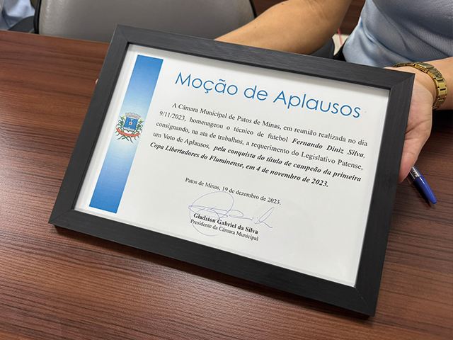 A Câmara Municipal de Patos de Minas realizou sessão especial na tarde desta terça-feira (19/12), para outorga do diploma de Moção de Aplausos ao técnico de futebol Fernando Diniz Silva, pela conquista do título de campeão da primeira Copa Libertadores do Fluminense, em 4 de novembro de 2023. Devido a compromissos assumidos anteriormente, Fernando Diniz não pôde estar presente, sendo representado por seu irmão, Paulo Cesar Silva.