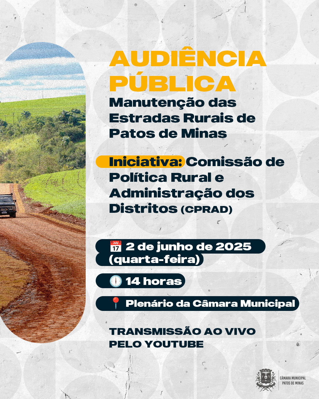 A Câmara Municipal de Patos de Minas, por meio da Comissão de Política Rural e Administração dos Distritos (CPRAD), convida toda a população para participar de Audiência Pública sobre a manutenção das estradas rurais do Município, a ser realizada na próxima quarta-feira, dia 2 de julho, às 14 horas, no plenário da Casa Legislativa.