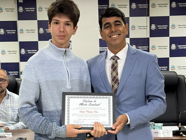 Encerrando a fase de discursos, o vereador Paulo Henrique Fernandes Caixeta, orador oficial da solenidade, destacou o orgulho do Legislativo em participar da entrega do Diploma de Mérito Estudantil “Prof. René de Deus Vieira”; ressaltou que os resultados alcançados pelos homenageados são fruto de disciplina, empenho e da confiança que cada um deposita no próprio potencial; reconheceu o papel fundamental de professores, gestores e colaboradores das instituições de ensino, que diariamente contribuem para o crescimento e a autonomia dos estudantes; agradeceu às famílias pelo apoio indispensável e aos vereadores e autoridades que fortalecem iniciativas voltadas à educação; e, em mensagem direta aos jovens, incentivou-os a continuar acreditando em si mesmos e a buscar novos desafios, ressaltando que o futuro pertence a quem se dedica.