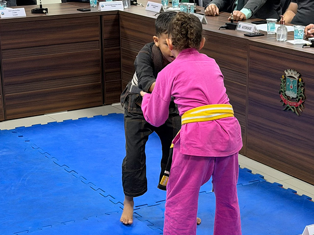 Após sua fala, alunos do projeto realizaram uma demonstração técnica de jiu-jitsu no plenário, evidenciando os resultados disciplinares da modalidade. A cerimônia também contou com uma apresentação de capoeira liderada por Mestre Charlim, celebrando a cultura e o esporte integrados.