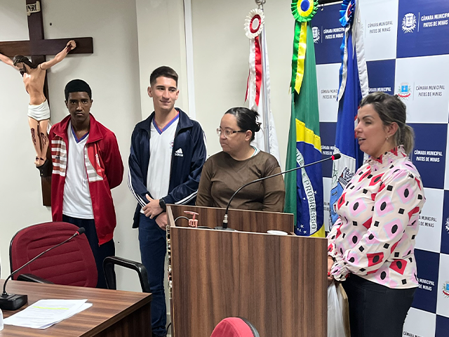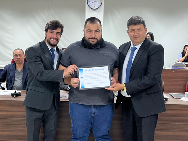 Durante a reunião ordinária dessa quinta-feira (3/11), os vereadores João Batista de Oliveira - Cabo Batista e Vitor Porto Fonseca Gonçalves procederam à entrega do diploma de Moção de Aplausos a Hugo Vinícius de Oliveira Silva, pelo brilhante trabalho desenvolvido em prol do esporte paraolímpico.