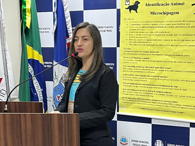 Durante a tribuna, a coordenadora salientou que o “Município investe sim, e investe pesado, em castração de animais”. De acordo com Geise, são, em média, 200 castrações mensais, que são feitas em parceria com a Aspaa. Além disso, ela informou que o Município de Patos de Minas conta com 9.400 microchipes e a previsão de aquisição de mais 4.000 microchipes. Geise ressaltou, ainda, que todas as pessoas cadastradas no CadÚnico terão direito à microchipagem gratuita de seus animais.
