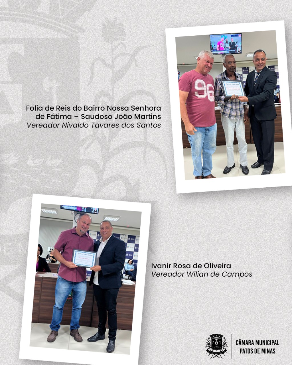 Dessa forma, por onde a folia passa, as pessoas fazem doações que, ao final das comemorações, são entregues para o Dispensário São Vicente de Paulo, o qual, através dessas rendas, mantém inúmeras famílias no município. Por tudo isso, a Folia de Reis do Bairro Nossa Senhora de Fátima – Saudoso João Martins está sendo homenageada com esta merecida homenagem de Mérito Cultural da Câmara Municipal de Patos de Minas.
