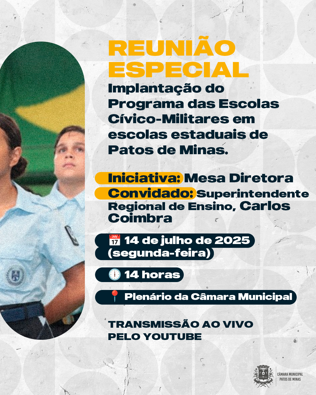 A Câmara Municipal de Patos de Minas, por iniciativa da Mesa Diretora, convida a comunidade interessada para participar de uma Reunião Especial na segunda-feira, 14 de julho de 2025, às 14h, no plenário da Casa Legislativa.