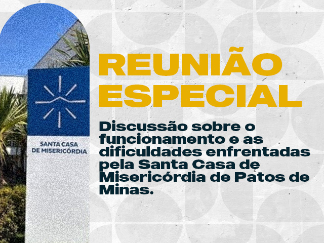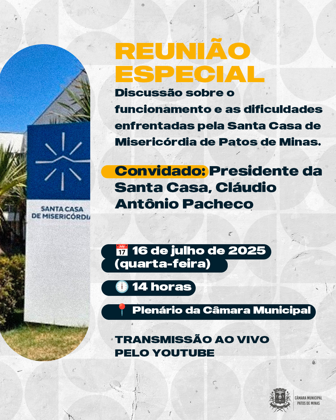 A Câmara Municipal de Patos de Minas, por iniciativa da Mesa Diretora, convida toda a população para participar da Reunião Especial que será realizada nesta quarta-feira (16/7), às 14 horas, no plenário da Casa Legislativa.