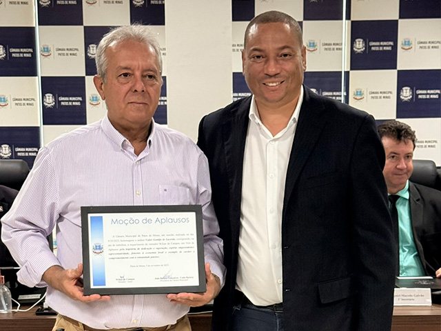 *Ao empresário Valter Gontijo de Lacerda pela trajetória de dedicação e superação, espírito empreendedor, representatividade, fomento à economia local e exemplo de caráter e comprometimento com a comunidade patense.