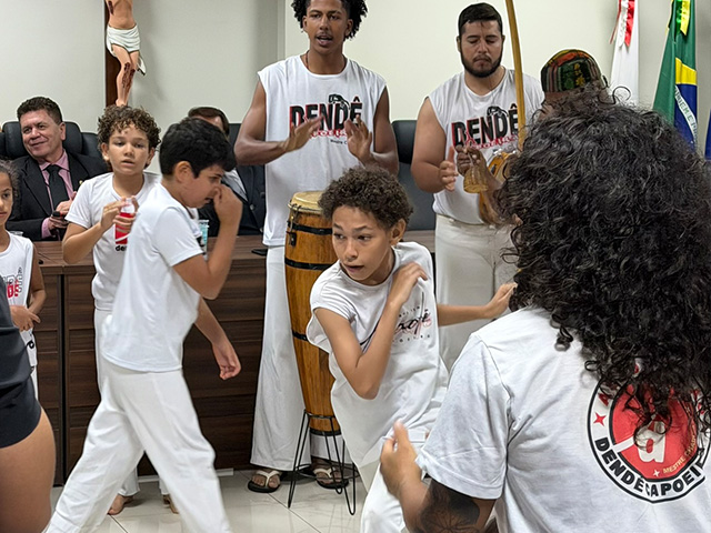 Após sua fala, alunos do projeto realizaram uma demonstração técnica de jiu-jitsu no plenário, evidenciando os resultados disciplinares da modalidade. A cerimônia também contou com uma apresentação de capoeira liderada por Mestre Charlim, celebrando a cultura e o esporte integrados.